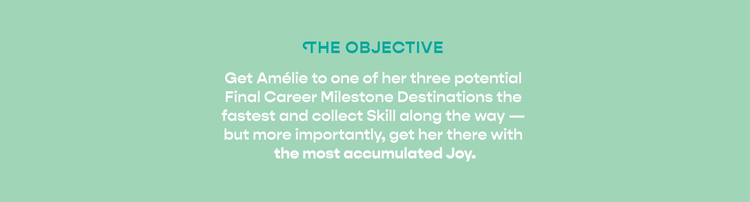 Created with the objective of visually depicting my career plans, Designing Amélie is a fully functional, 2-4 player board game. It includes a 20x30 inch quadfold game board, a game instruction booklet, 53 game cards, 100 skill and joy tokens, four persona game pieces, and a custom dice.